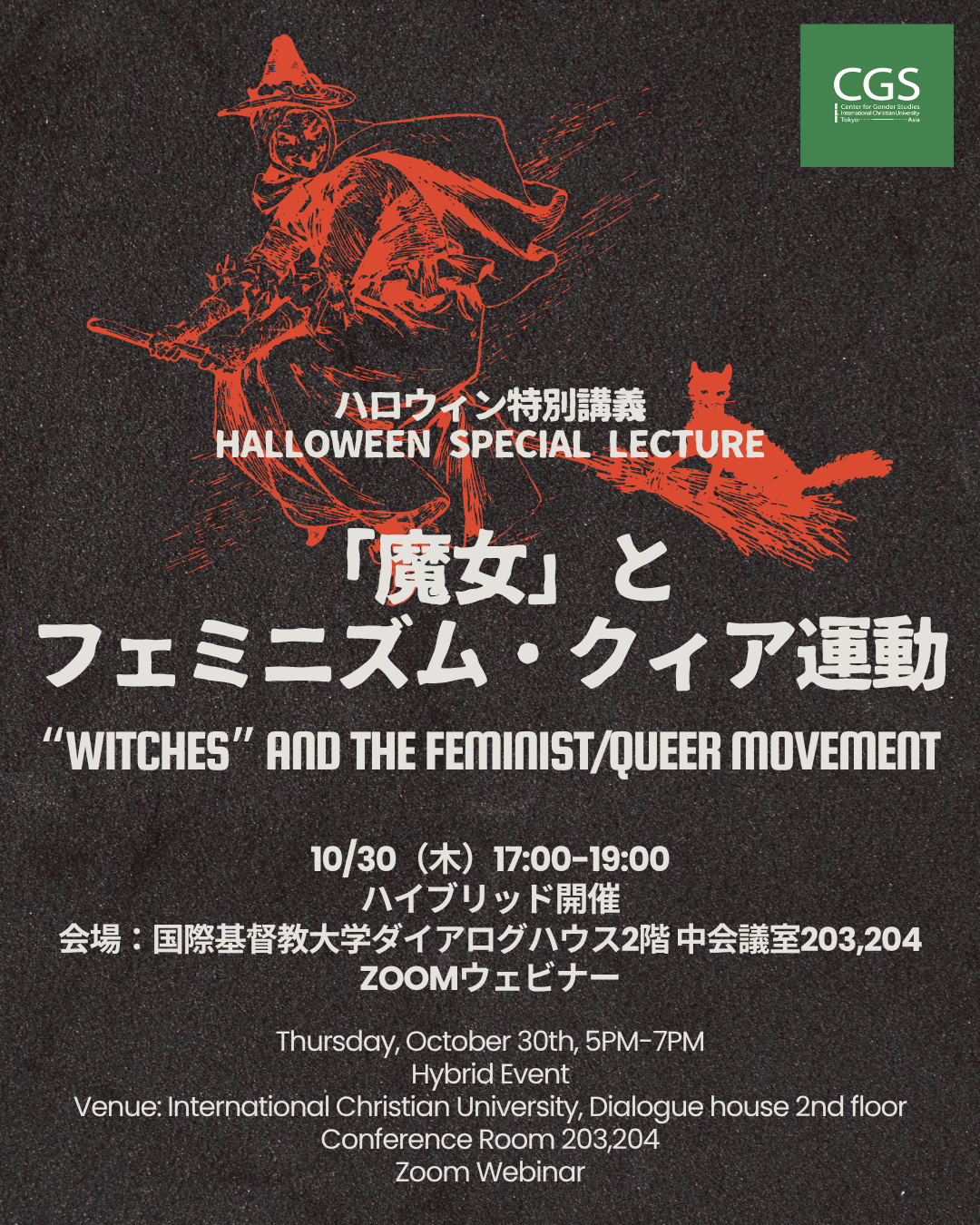 A poster with a black background and a red line drawing of a witch flying on a broomstick. Text reads “HALLOWEEN SPECIAL LECTURE” and “WITCHES AND THE FEMINIST/QUEER MOVEMENT.” Event details include: Thursday, October 30th, 5PM–7PM; International Christian University, Dialogue House 2F, Conference Room 203, 204; Hybrid Event with Zoom Webinar. Organized by the Center for Gender Studies (CGS) at ICU. Design features a Halloween theme with red and black tones.