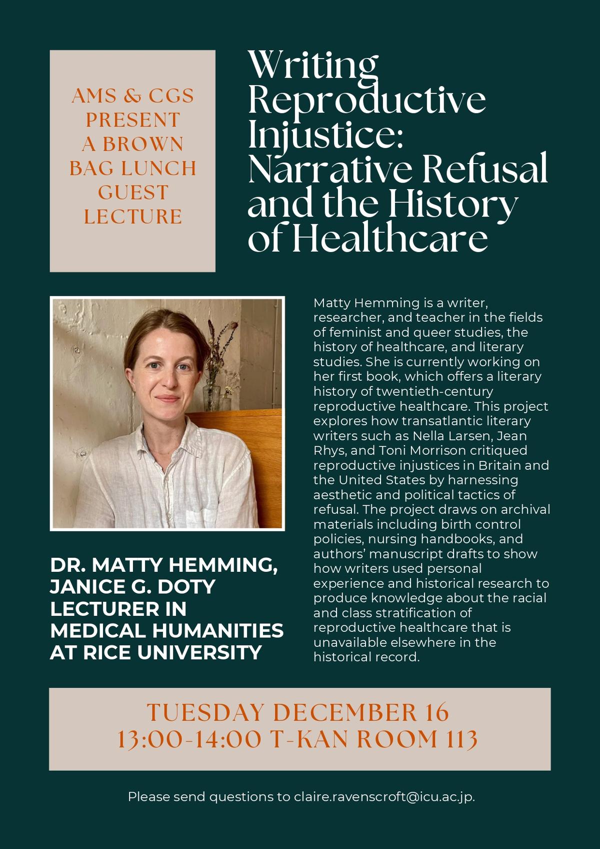 AMS(アメリカン・メディカル・ソサエティ)とCGSの共催で、ライス大学よりマティ・ヘミング先生をお呼びして特別講義をしていただきます。ヘミング先生のご専門は文学研究、フェミニズム研究、歴史学、医療の交差点に位置し、本講演ではアメリカとイギリスにおける生殖医療の不平等をテーマとした最新の著書プロジェクトについてお話しいただきます。