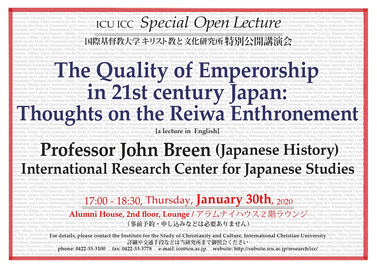 ICC Special Open Lecture, "The Quality of Emperorship in 21st century Japan: Thoughts on the Reiwa Enthronement" from 17:00-18:30, on Thursday, January 30th, 2020