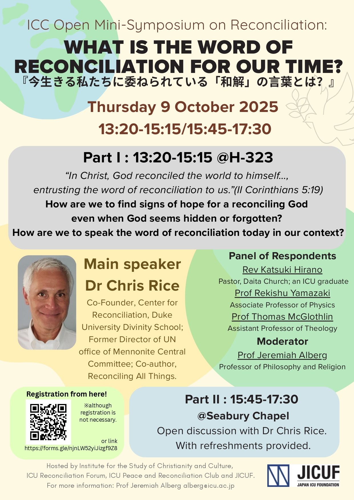 終了しました2025年10月9日(木)13:20-15:15/ 15:45-17:30 特別公開講演会:今生きる私たちに委ねられている「和解」の言葉とは?
