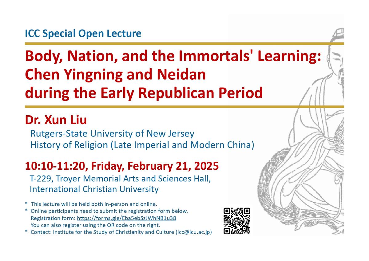 終了しました2025年2月21日(金)10:10-11:20 ICC特別公開講演会:Body, Nation, and the Immortals' Learning: Chen Yingning and Neidan during the Early Republication Period