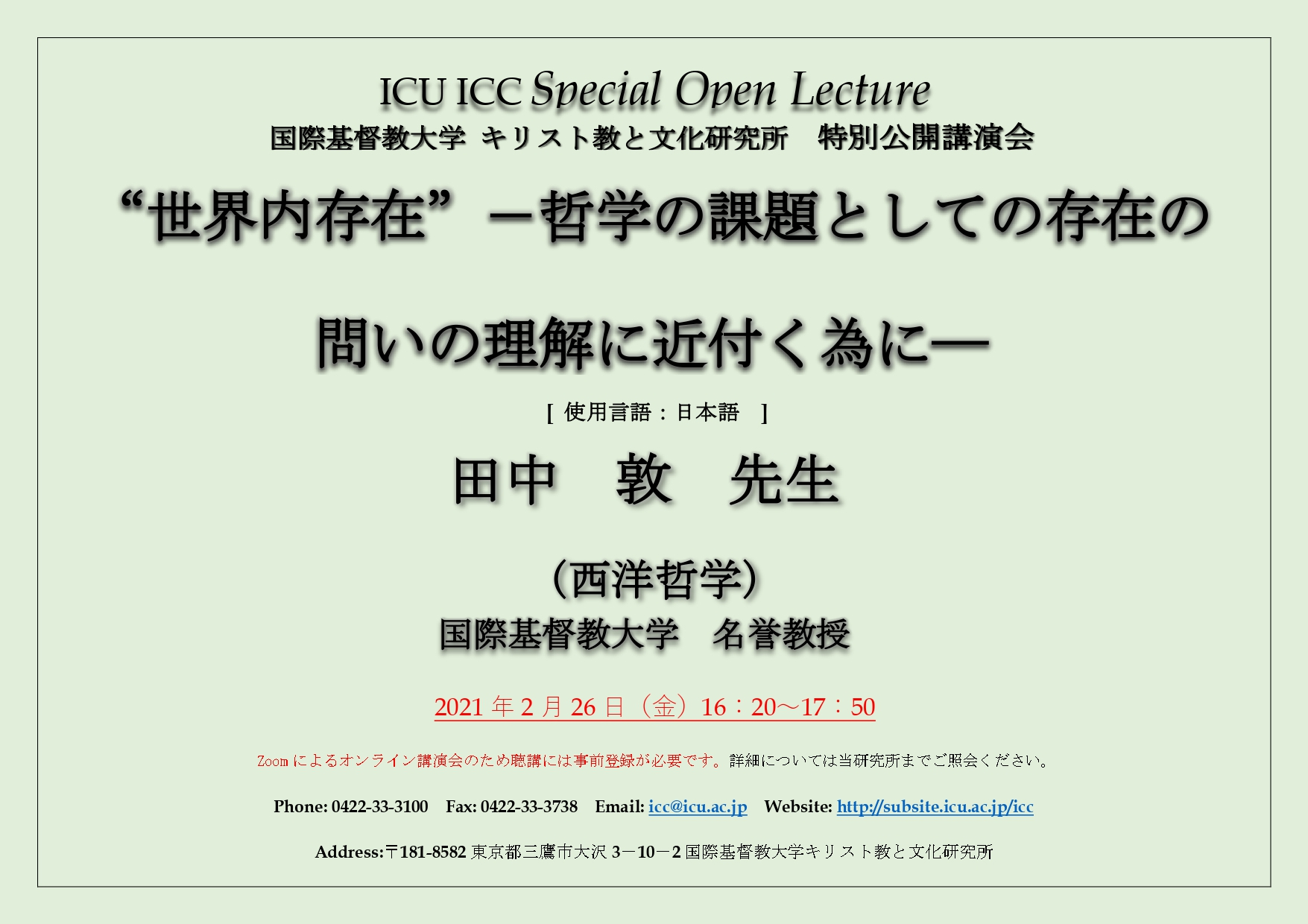 終了しました2021年2月26日(金)16:20-17:50 ICC特別公開講演 "世界内存在"-哲学の課題としての存在の 問いの理解に近付く為に―*