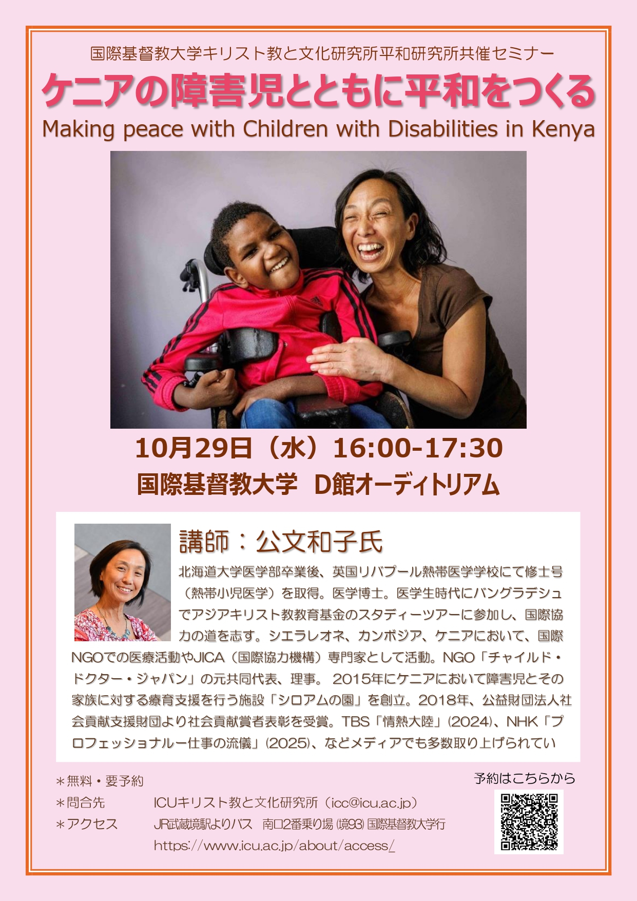 終了しました2025年10月29日(水)16:00-17:30 特別公開講演会:ケニアの障害児とともに平和をつくる