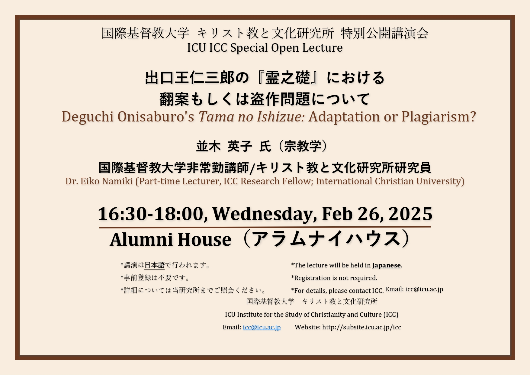 終了しました2025年2月26日(水)16:30-18:00 特別公開講演会:出口王仁三郎の『霊之礎』における翻案もしくは盗作問題について*