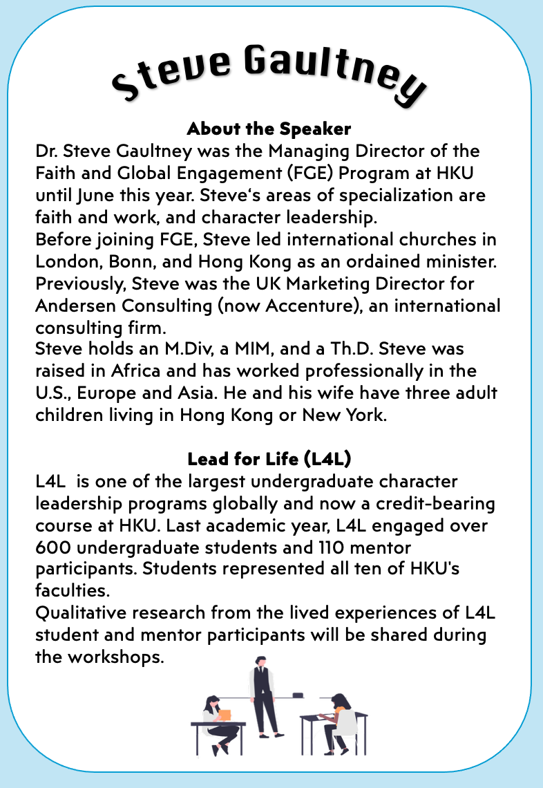The workshops are led by Dr. Steve Gaultney, one of the founding designers of HKU’s flagship leadership program, Lead for Life (L4L). L4L is one of the largest undergraduate character leadership programs globally and now a credit-bearing course at HKU. Last academic year, L4L engaged over 600 undergraduate students and 110 mentor participants. Students represented all ten of HKU's faculties. Qualitative research from the lived experiences of L4L student and mentor participants will be shared during the workshops.